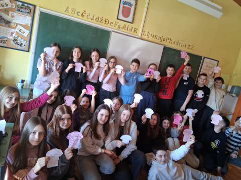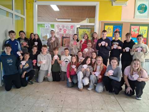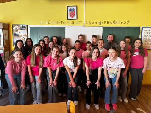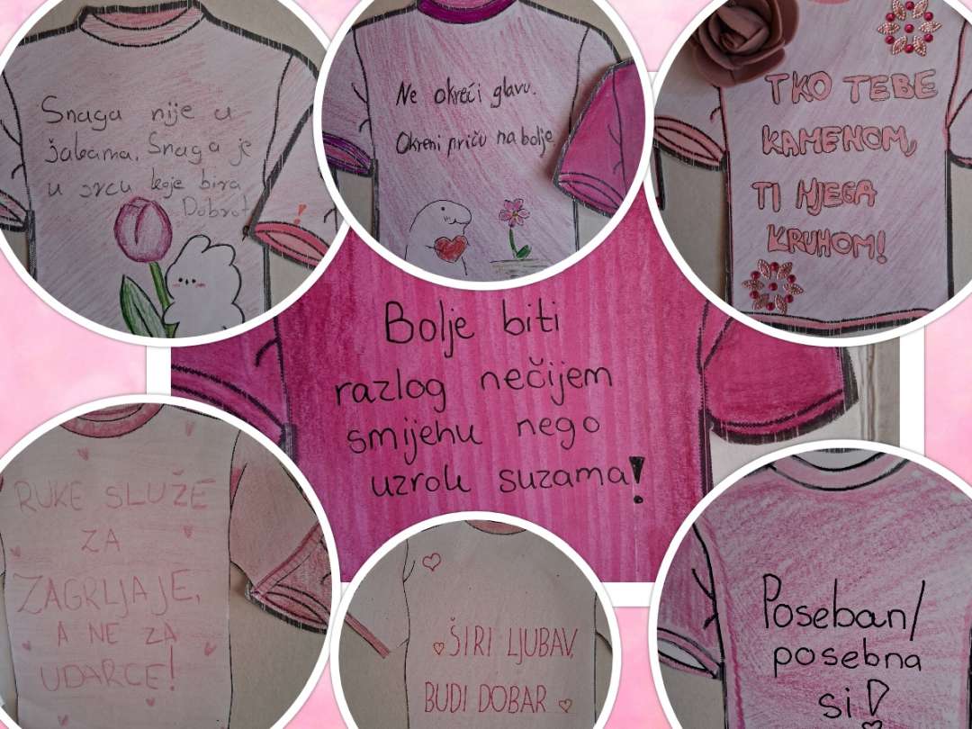Učenici 4. a, 6. a i 6. b razreda, uz pjesmu Arsena Dedića Prijateljstvo, s mnogo su pažnje i kreativnosti dizajnirali svoje ružičaste majice. Na njima su ispisali snažne poruke protiv svih oblika nasilja, ali i riječi podrške, ohrabrenja i nade. Njihovi radovi sada krase učionice i druge prostore škole, podsjećajući nas koliko su razumijevanje, empatija i prijateljstvo važni u svakodnevnom školskom životu.